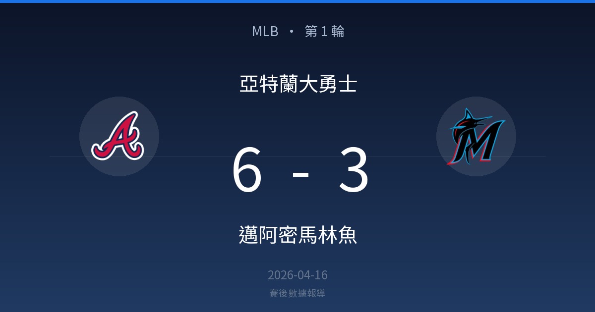 亞特蘭大勇士 6-3 邁阿密馬林魚|MLB 第 1 輪賽後戰報