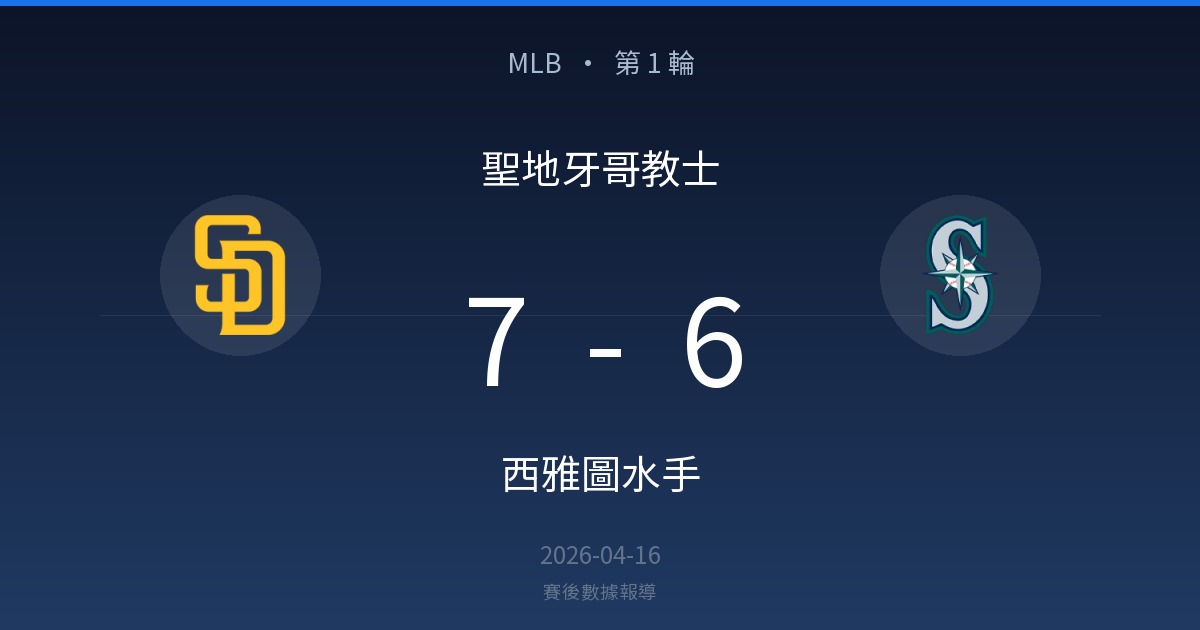 聖地牙哥教士 6 勝 · 0 平 · 4 負 西雅圖水手 (近 10 場)