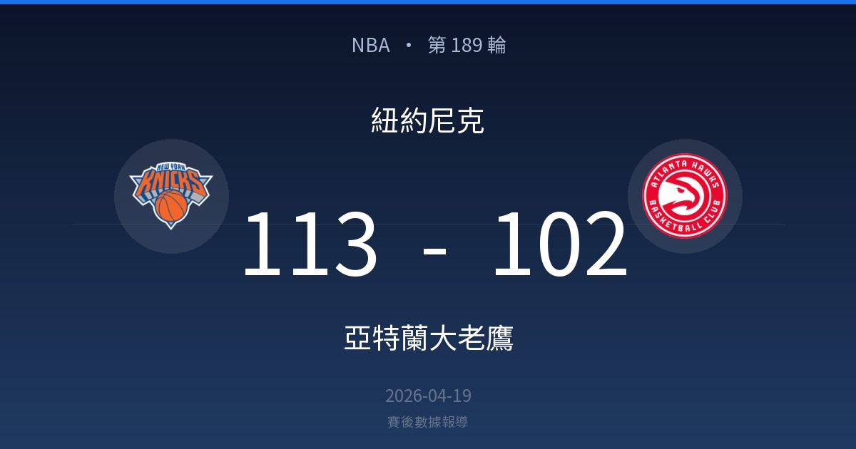 紐約尼克 113 – 102 亞特蘭大老鷹