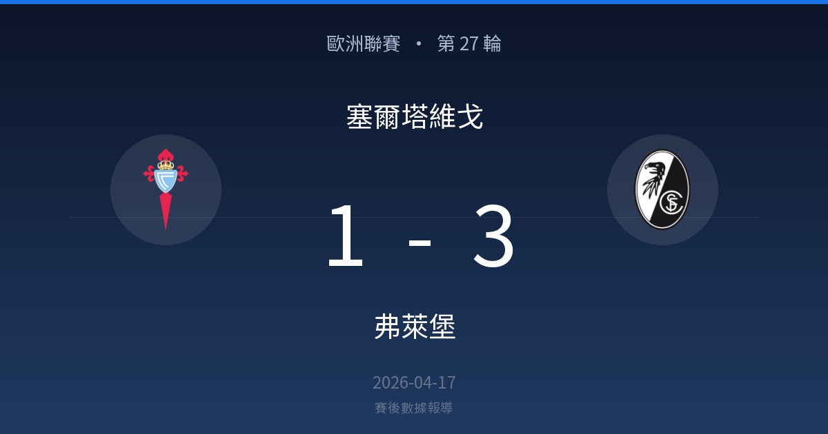 塞爾塔維戈 0 勝 · 0 平 · 2 負 弗萊堡 (近 2 場)