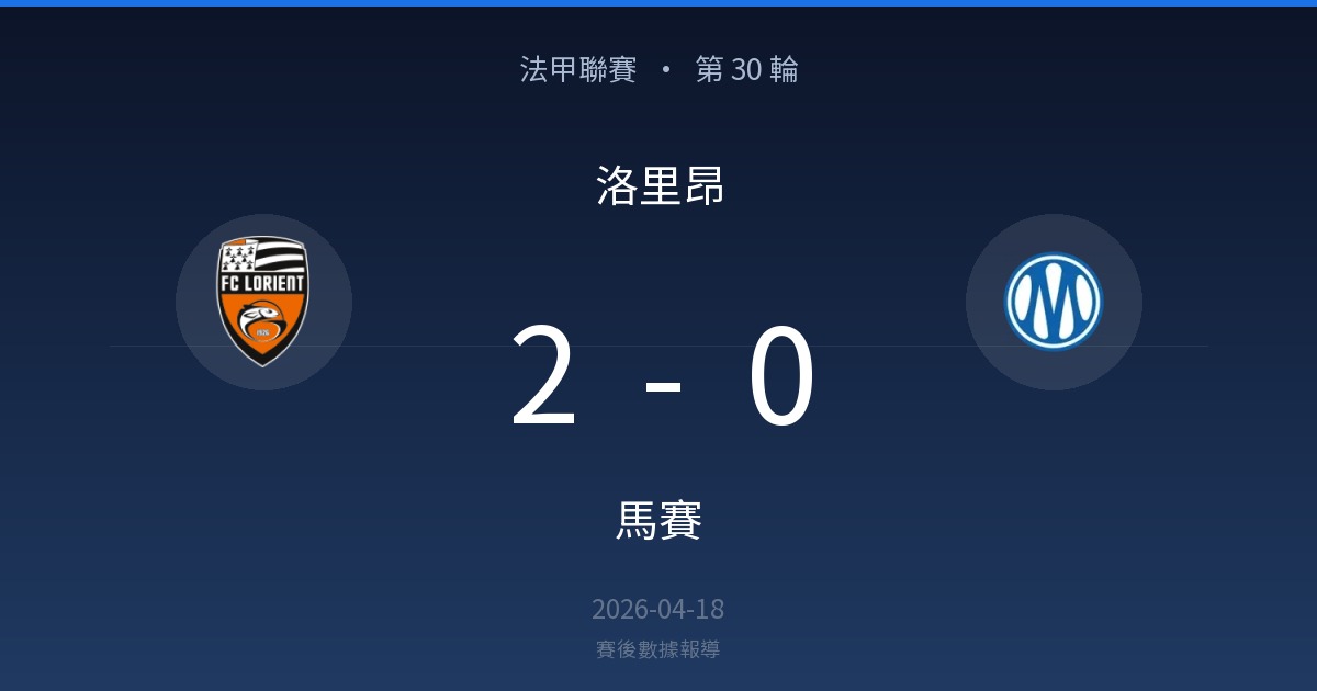 洛里昂 2-0 馬賽|法甲聯賽 第 30 輪賽後戰報