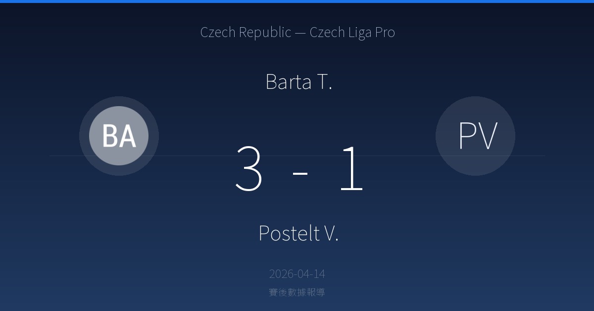 Barta T. 3-1 Postelt V.|Czech Republic — Czech Liga Pro賽後戰報