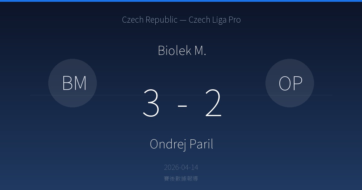 Biolek M. 4 勝 · 0 平 · 6 負 Ondrej Paril (近 10 場)