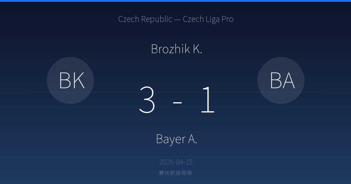 Brozhik K. 3-1 Bayer A.|Czech Republic — Czech Liga Pro賽後戰報