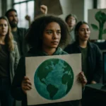 • Young woman holds a globe poster at a climate protest while others in the background raise their fists in solidarity.