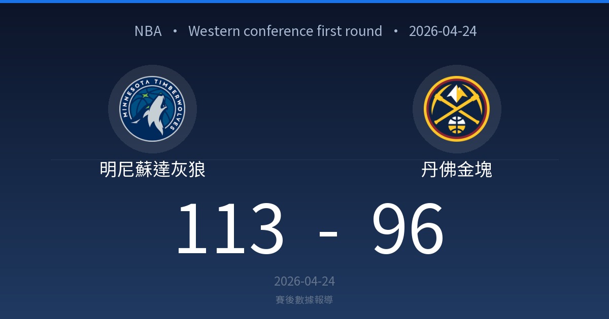 NBA (NBA) Western conference first round:明尼蘇達灰狼 113-96 丹佛金塊。比賽日期:2026-04-24。完整比賽數據、射門分佈、最佳球員評分、陣容、事件時間軸與歷史對戰。