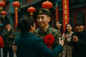 Young soldier in camouflage with a red ribbon on his chest is embraced by a man in a blue coat during a festive street scene with red lanterns and onlookers clapping.