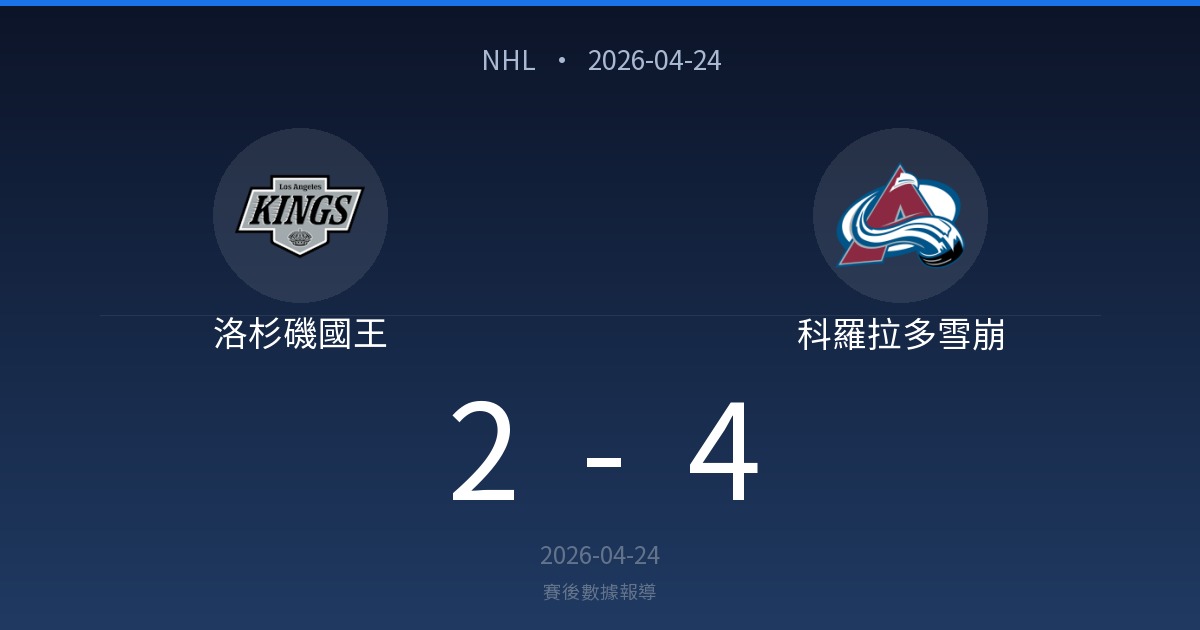 洛杉磯國王 2-4 科羅拉多雪崩|NHL賽後戰報(2026-04-24) 2026 年 4 月 24 日 NHL (NHL):洛杉磯國王 2-4 科羅拉多雪崩。比賽日期:2026-04-24。完整比賽數據、射門分佈、最佳球員評分、陣容、事件時間軸與歷史對戰。