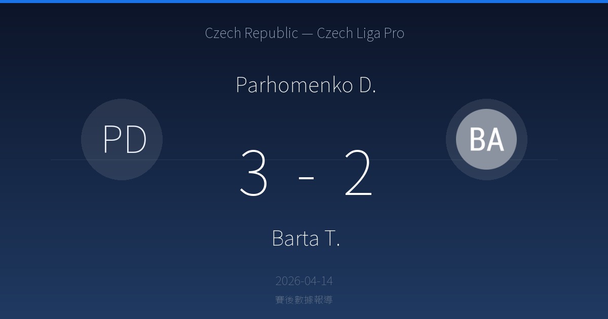 Czech Republic — Czech Liga Pro (Czech Republic — Czech Liga Pro):Parhomenko D. 3-2 Barta T.。比賽日期:2026-04-14。完整比賽數據、射門分佈、最佳球員評分、陣容、事件時間軸與歷史對戰。