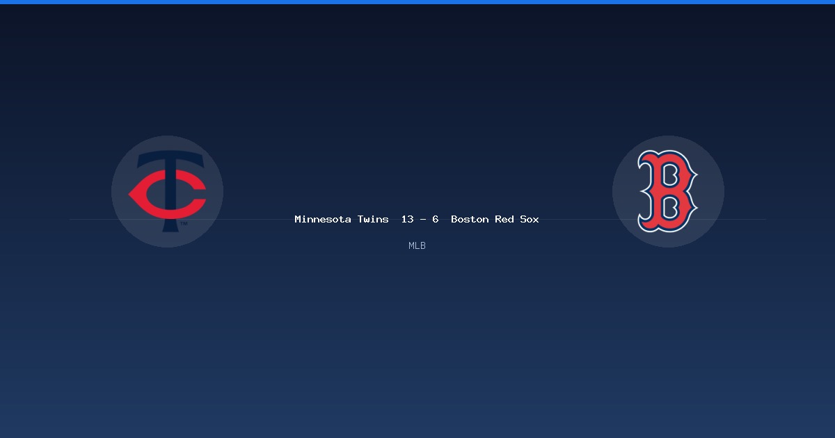 MLB (MLB) 第 1 輪:明尼蘇達雙城 6-0 波士頓紅襪。比賽日期:2026-04-15。完整比賽數據、射門分佈、最佳球員評分、陣容、事件時間軸與歷史對戰。