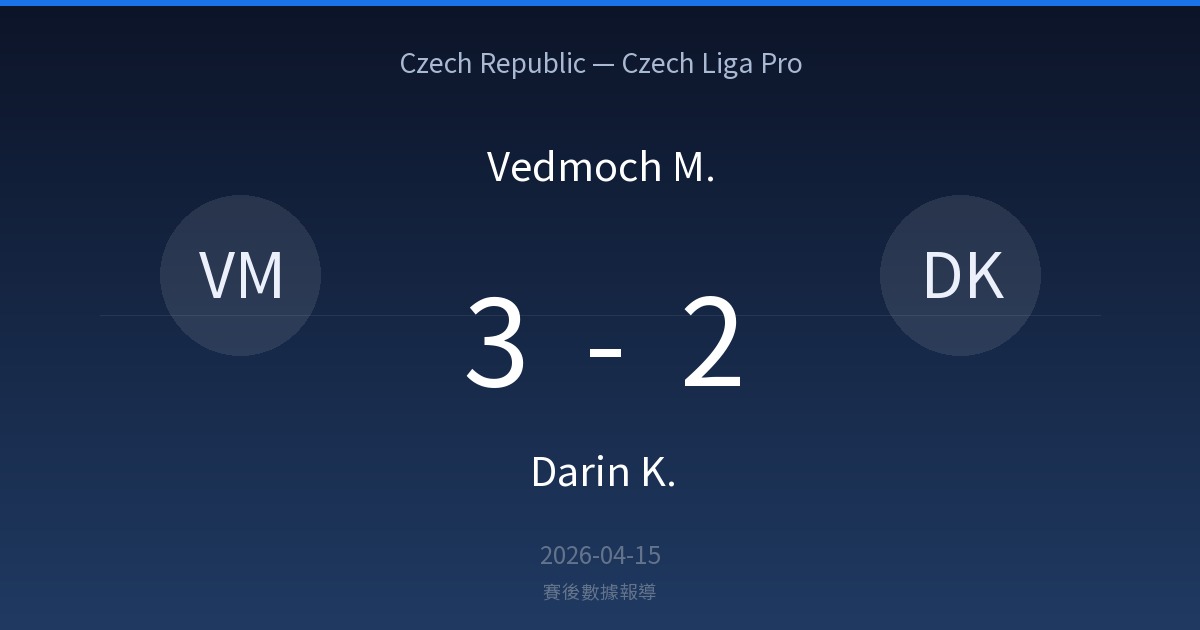 Czech Republic — Czech Liga Pro (Czech Republic — Czech Liga Pro):Vedmoch M. 3-2 Darin K.。比賽日期:2026-04-15。完整比賽數據、射門分佈、最佳球員評分、陣容、事件時間軸與歷史對戰。