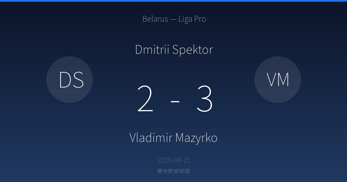 Dmitrii Spektor 2-3 Vladimir Mazyrko|Belarus — Liga Pro賽後戰報