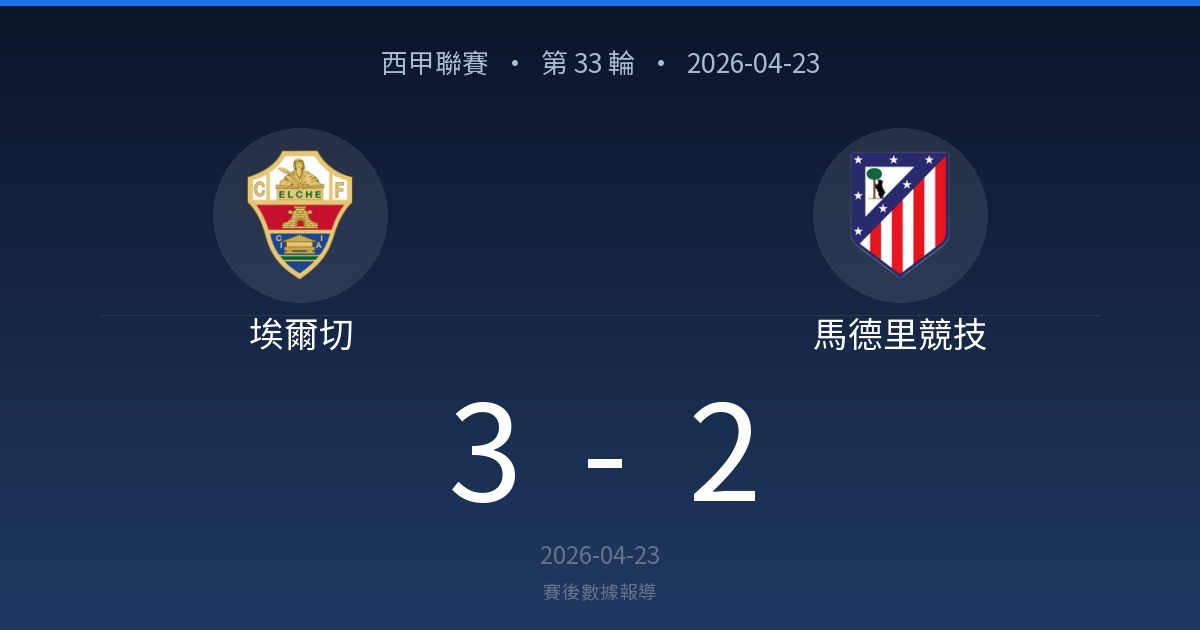 西甲聯賽 (La Liga) 第 33 輪:埃爾切 3-2 馬德里競技。比賽日期:2026-04-23。完整比賽數據、射門分佈、最佳球員評分、陣容、事件時間軸與歷史對戰。