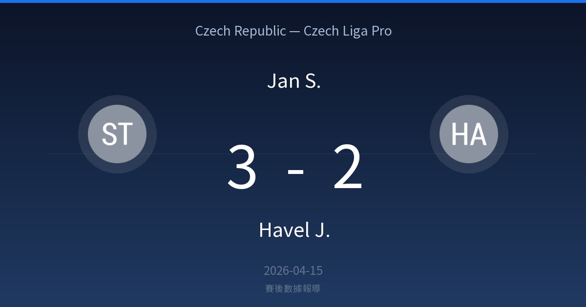 Czech Republic — Czech Liga Pro (Czech Republic — Czech Liga Pro):Jan S. 3-2 Havel J.。比賽日期:2026-04-15。完整比賽數據、射門分佈、最佳球員評分、陣容、事件時間軸與歷史對戰。