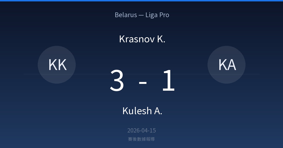 Belarus — Liga Pro (Belarus — Liga Pro):Krasnov K. 3-1 Kulesh A.。比賽日期:2026-04-15。完整比賽數據、射門分佈、最佳球員評分、陣容、事件時間軸與歷史對戰。