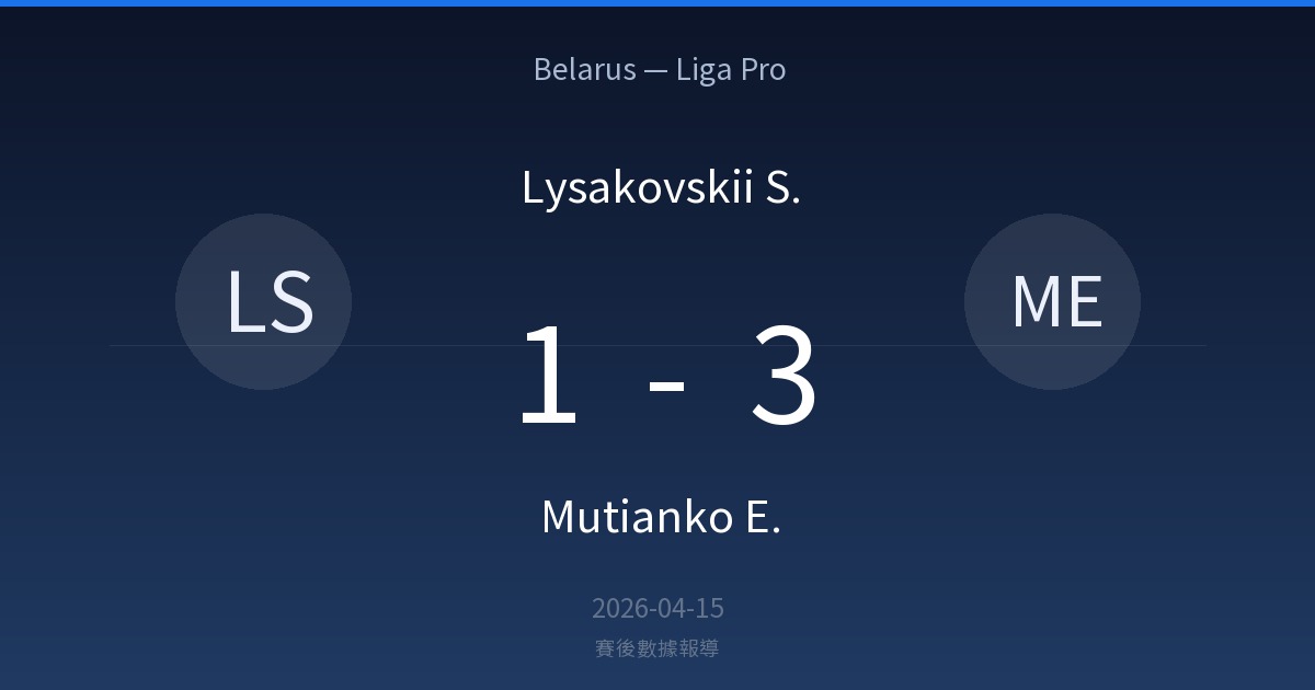 Belarus — Liga Pro (Belarus — Liga Pro):Lysakovskii S. 1-3 Mutianko E.。比賽日期:2026-04-15。完整比賽數據、射門分佈、最佳球員評分、陣容、事件時間軸與歷史對戰。