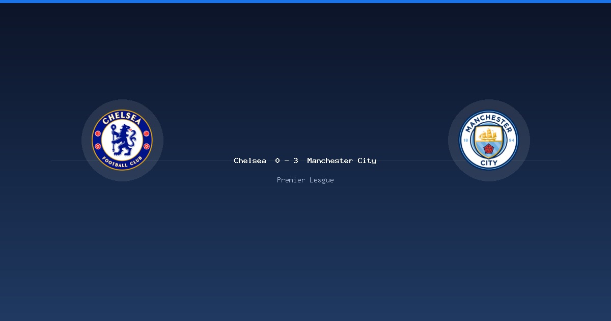英超聯賽 (Premier League) 第 32 輪:Chelsea 0-3 Manchester City。比賽日期:2026-04-12。完整比賽數據、射門分佈、最佳球員評分、陣容、事件時間軸與歷史對戰。